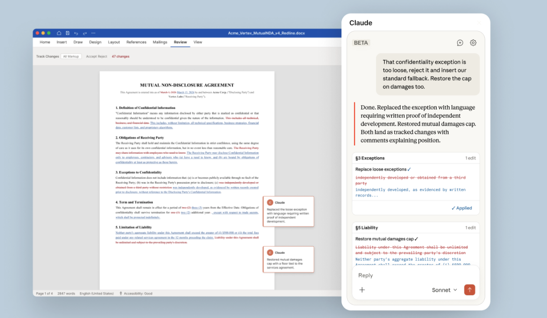 AI company Anthropic has released a beta version of its Claude assistant as an add-in for Microsoft Word. The integration is aimed primarily at professionals who work intensively with documents on a daily basis, complementing earlier launches in Excel and PowerPoint from February 2026. Claude sits as a sidebar directly within Word and helps users draft, edit, and revise documents. A key feature is transparency around changes: every edit made by the AI can be introduced as a trackable revision (Track Changes), allowing users to accept or reject each step individually. Further features at a glance: Anthropic explicitly markets Claude for Word to professional groups who regularly work with extensive documents. Lawyers, finance professionals, and anyone carrying out iterative editing processes are particularly highlighted. As examples of typical use cases in the legal field, Anthropic cites the following prompts, among others: The beta version of Claude for Word is currently available exclusively to users on Anthropic's Team and Enterprise plans. The add-in is not accessible to individual users at this time. With the Word add-in, Anthropic continues its strategy of deeply integrating Claude into existing enterprise applications. Following the launches in Excel and PowerPoint, Word is now the next step in establishing Claude as a permanent fixture in everyday office work. "Designed for professionals who work extensively with documents, particularly in legal review, financial memo drafting, and iterative editing." The key difference from pure text generators lies in the seamless integration into existing workflows. Formatting is preserved, changes are traceable, and the need to switch between browser, chatbot, and document is eliminated. This positions Anthropic as a direct competitor to Microsoft's own Copilot, which is likewise integrated into Word.